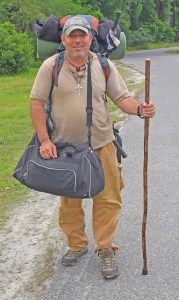 My Daughter and I met Gregory today August 14 2015 in Haverstraw NY. While waiting for the Ferry to Ossining NY. He walked up with his back pack and walking stick. Crucifix hanging from the chain around his neck. He walked right up to us. Nothing about him was scary. We visited with him while waiting for the ferry. Very nice man. He told us of his journey. When the ferry arrived we got on. He sat a few seats in front of us. After getting to Ossining I asked him if my Daughter could take a photo of him. He said yes. We got off the ferry before him. He caught up to us and talked with us as we walked. He posed for a photo for my Daughter. We wished him luck on his journey.
