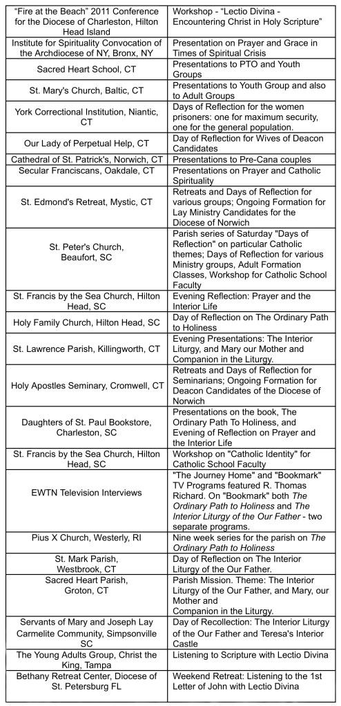 I recently attended a retreat on Lectio Divina given by Dr. Thomas Richard, it was wonderful. Scripture is so much richer to me now and more personal. Dr. Richard and his wife Deborah are so knowledgeable about Church teachings and the Bible I feel I have a much deeper understanding of my faith. I want to thank them for all the wonderful insights they shared with us. It truly was special weekend